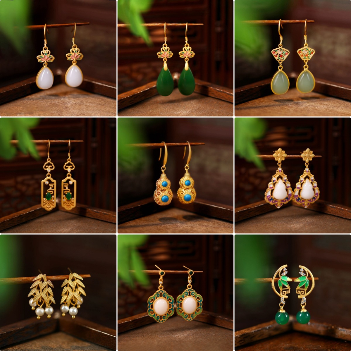 色落ちしにくい福緑瓢箪レトロ典雅模造和田碧玉金メッキイヤリング宮廷風モザイク耳飾り女
