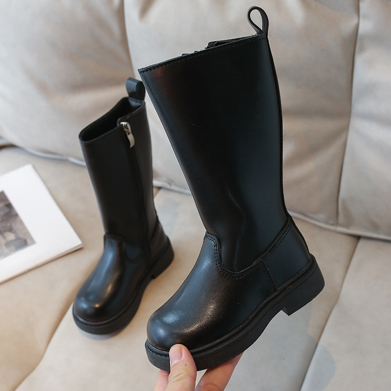 女の子用子供長靴2025秋新作暖かいハイカット万能ファッションブーツ裏起毛プリンセスロングレザーブーツ