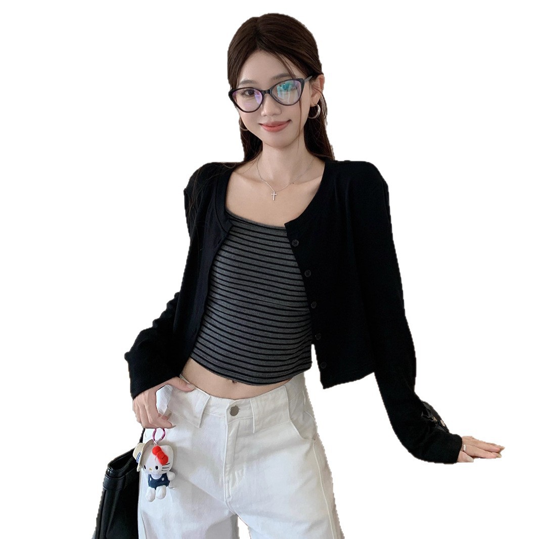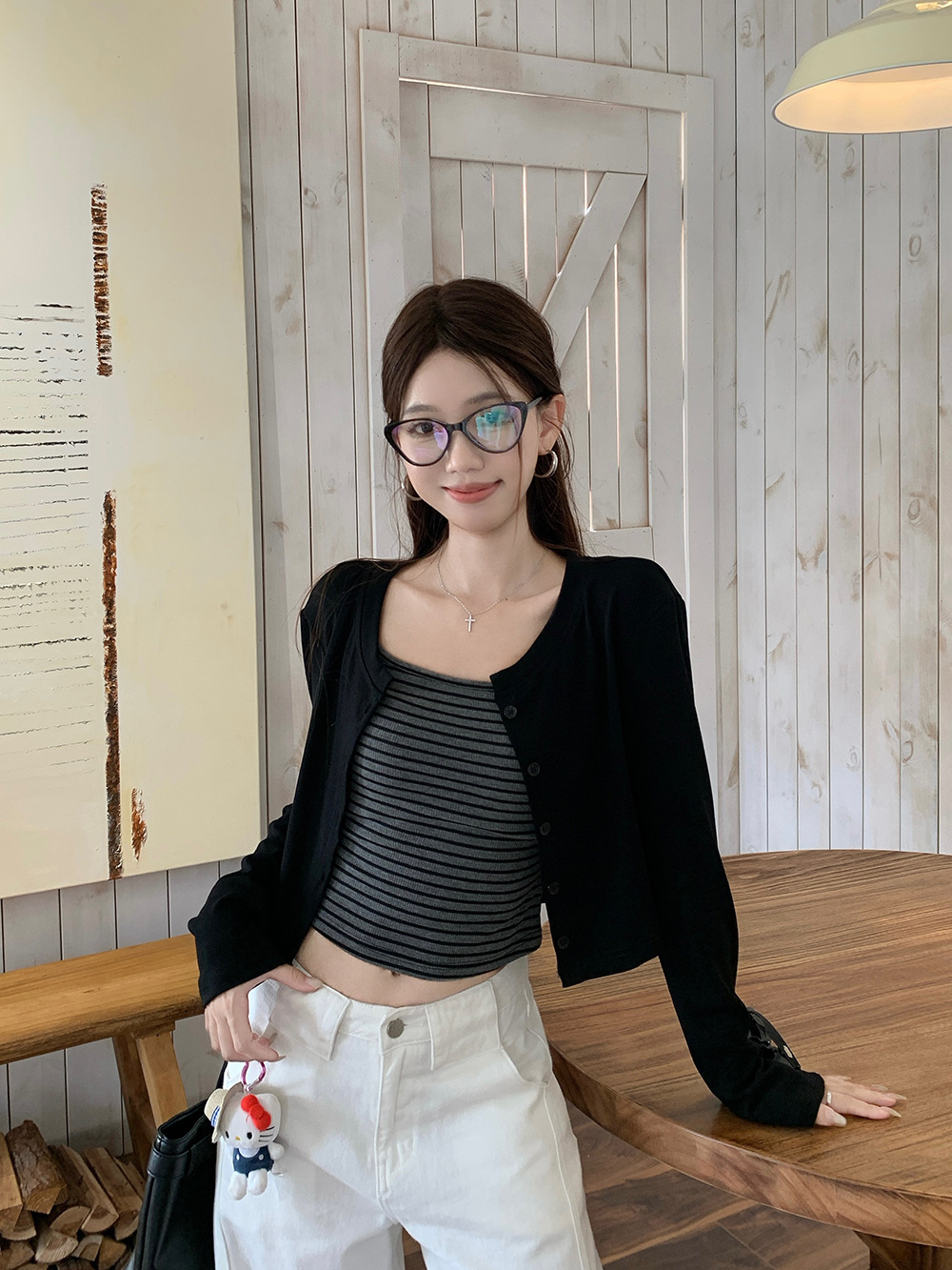 小众撞色条纹吊带背心辣妹套装女秋季气质长袖开衫短款外套两件套