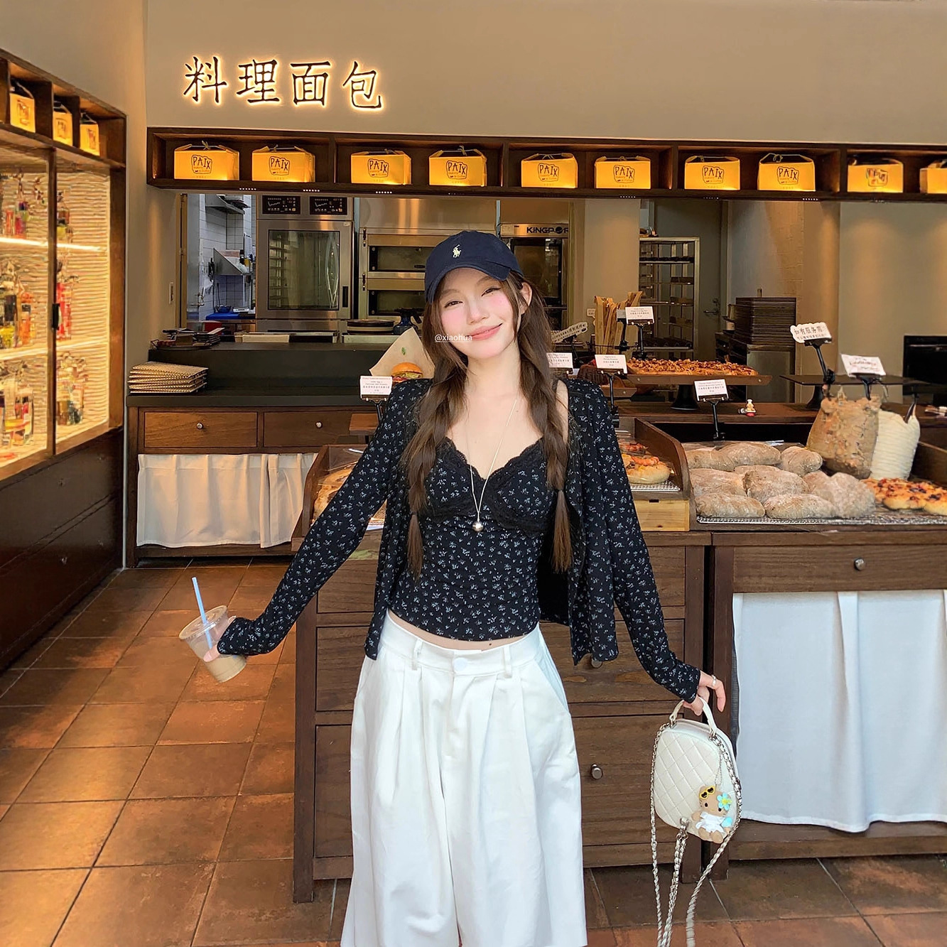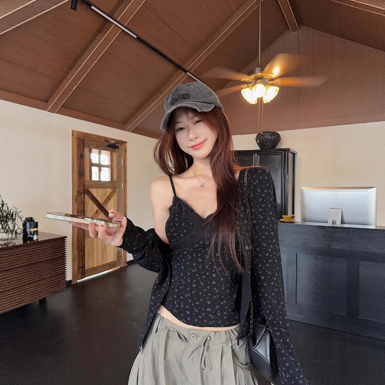 甜美套装复古碎花吊带背心女装早秋季叠穿显瘦黑色开衫外套两件套