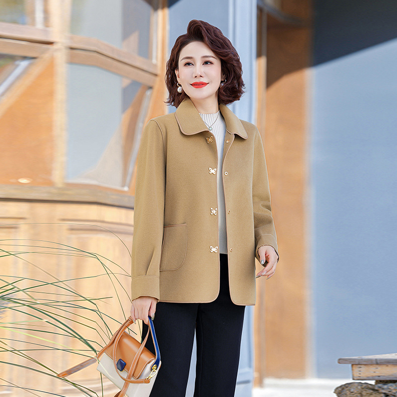 中年のお母さんの春の服のコートの洋気の両面のラシャの2025新型の中高年の女性の春秋の短いタイプの洋気の上着