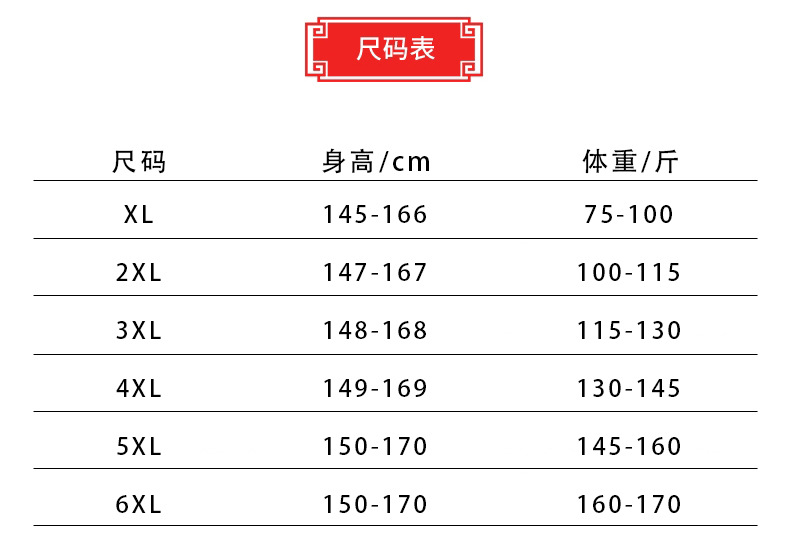 尺码 XL-- 建议75-100斤,2XL -- 建议100-115斤,3XL -- 建议115-130斤,4XL -- 建议130-145斤,5XL -- 建议145-160斤,6XL -- 建议160-175斤