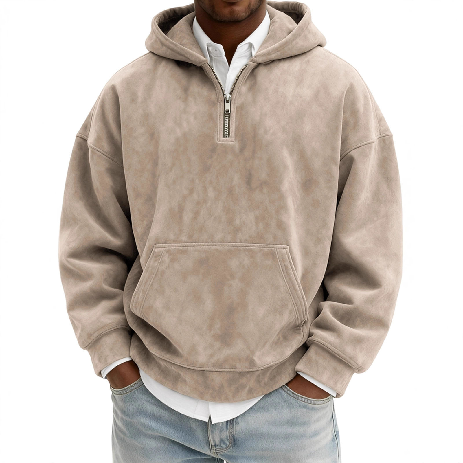 跨境亚马逊美式做旧连帽卫衣男士 纯色麂皮绒半拉链连帽衫秋冬男