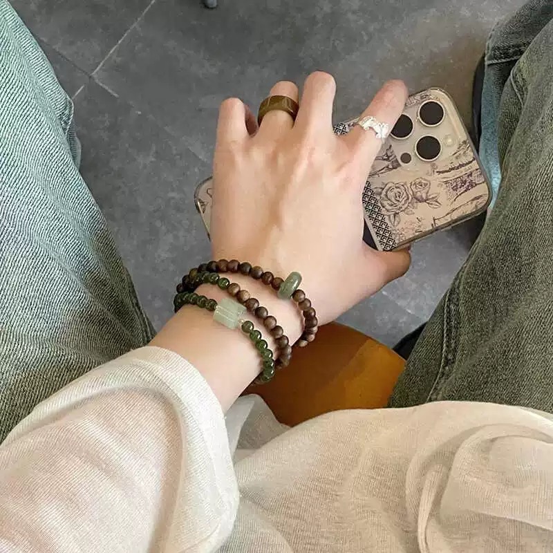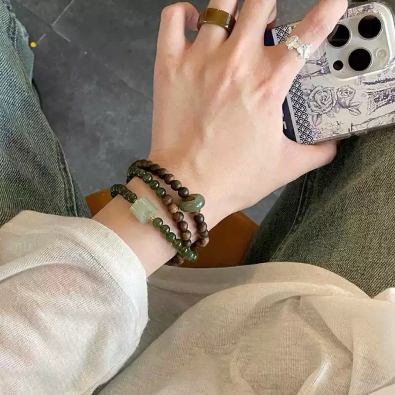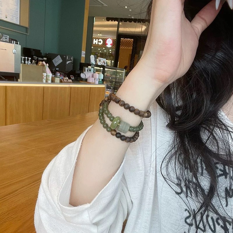 文莱沈香木手串 白木香 女性用 天然和田玉ビーズ ダブルリングブレスレット 新中式風