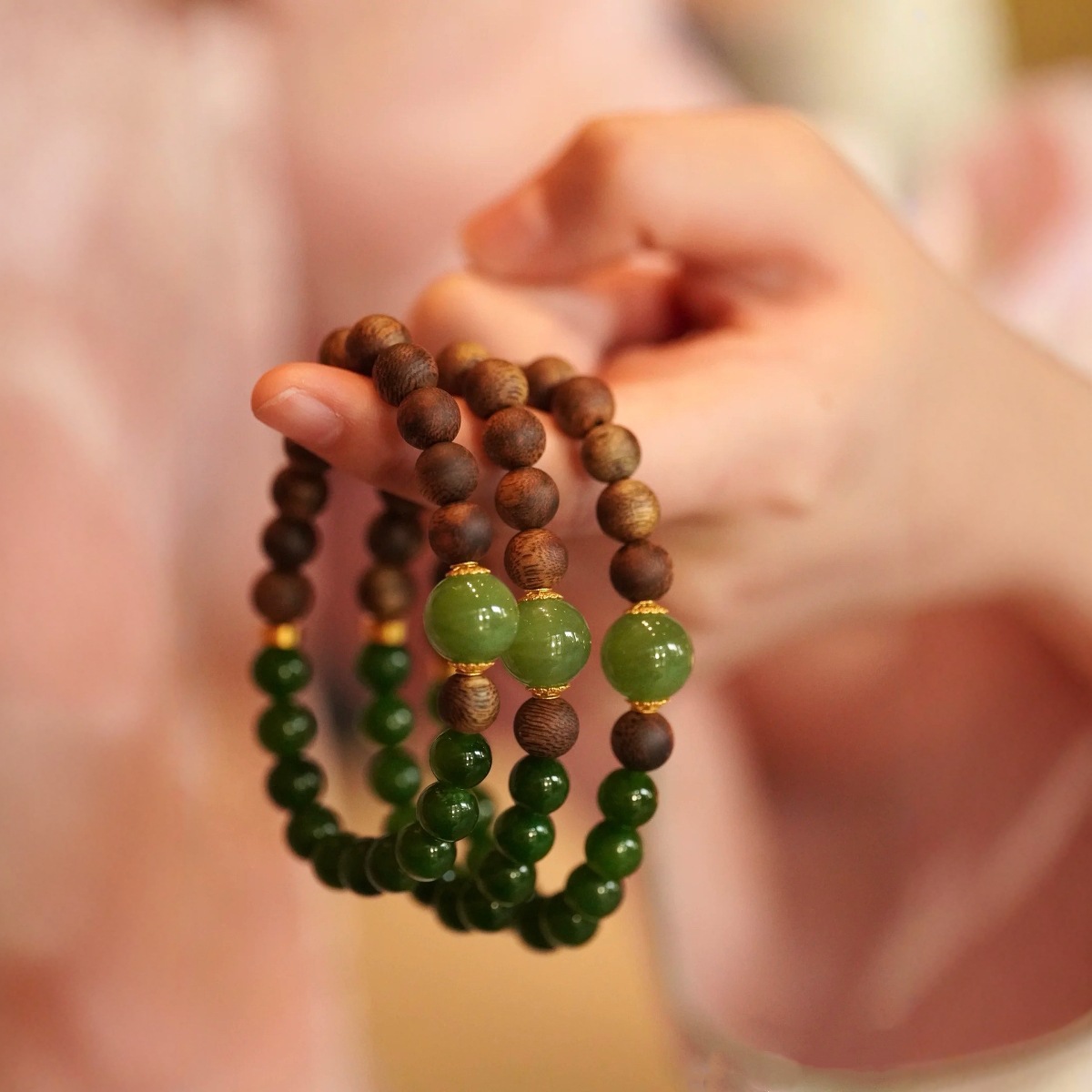 文莱沈香仏珠天然翡翠白木香和田玉運命珠半山半水国風手飾り