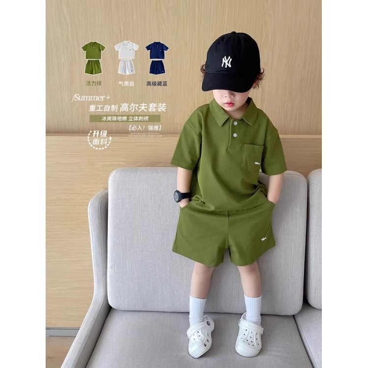 男の子ツーピースクール夏2025新しい子供用ポロカラー半袖ショーツハンサムボーイカジュアルスーツ