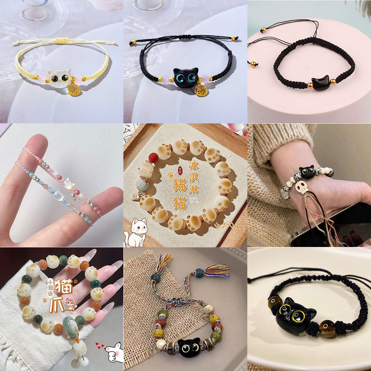 赤い本の爆発的な手で猫の鎖を編むレトロでかわいい大きな目の数珠猫の冷たい風の小さな手のひも
