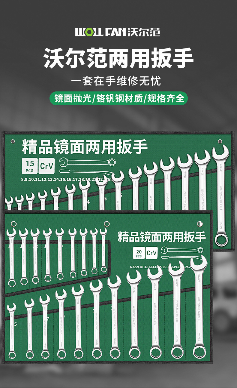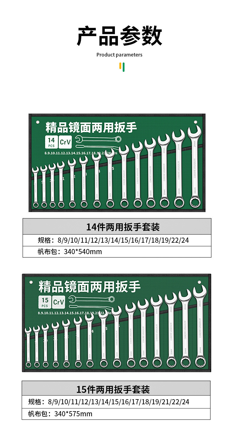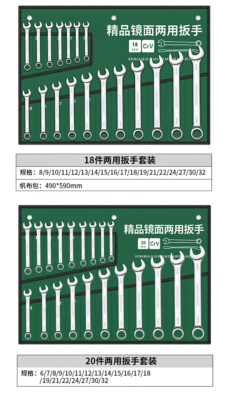规格型号 梅开两用扳手8件套【镜面款】,梅开两用扳手14件套【镜面款】,梅开两用扳手15件套【镜面款】,梅开两用扳手18件套【镜面款】,梅开两用扳手20件套【镜面款】,梅开两用扳手10件套【珍珠镍】,梅开两用扳手14件套【珍珠镍】,梅开两用扳手15件套【珍珠镍】,梅开两用扳手18件套【珍珠镍】