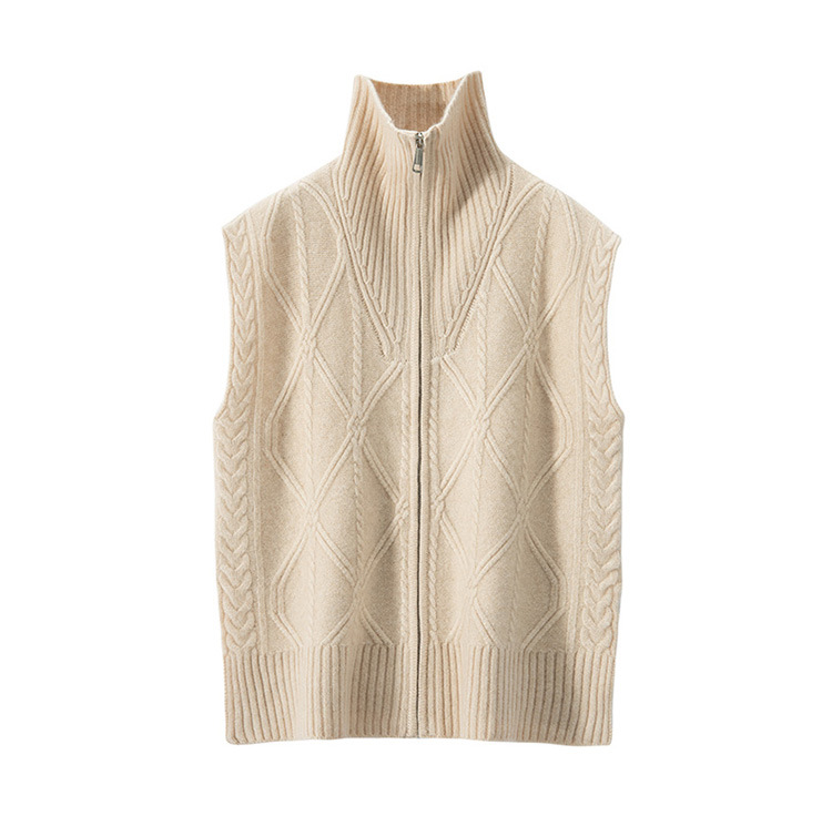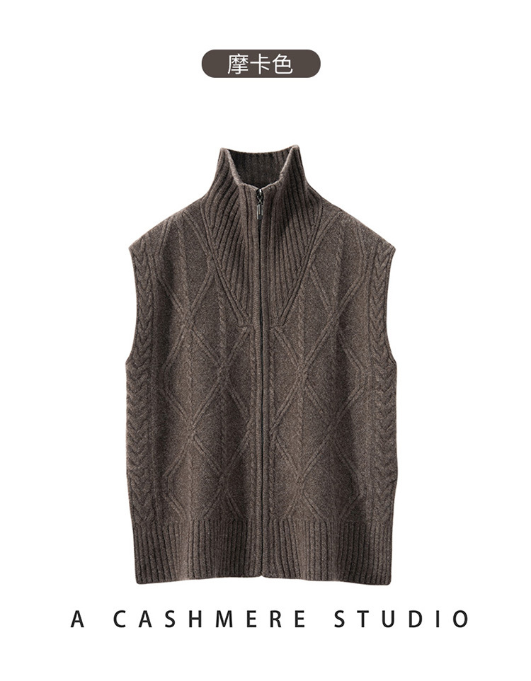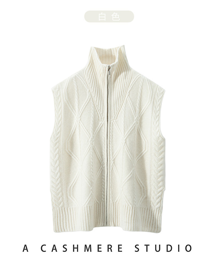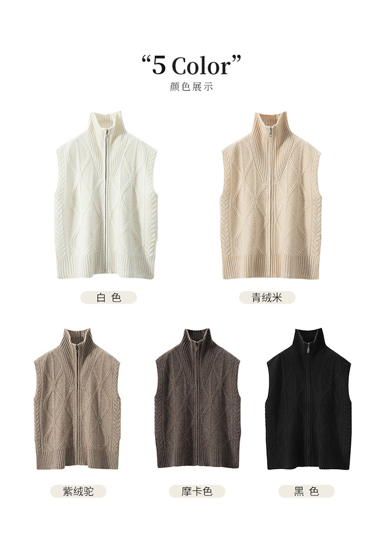 全身绞花纯色女山羊绒针织马甲半开高领无袖上衣毛衣外搭叠穿坎肩