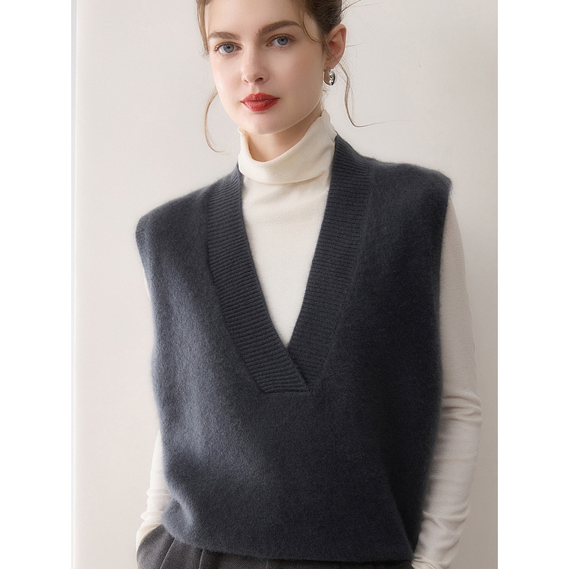 秋冬新款100%纯山羊绒女针织马甲无袖坎肩深V领叠穿宽松保暖上衣