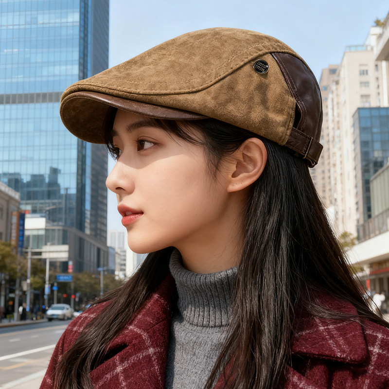 秋冬皮革麂皮绒前进帽子女美式复古百搭报童鸭舌帽男显脸小贝雷帽