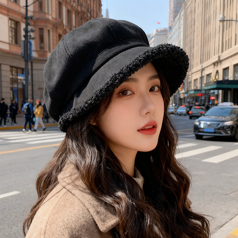 秋冬帽子女休闲羊羔毛百搭渔夫帽日系防寒护耳加厚盆帽八角贝雷帽