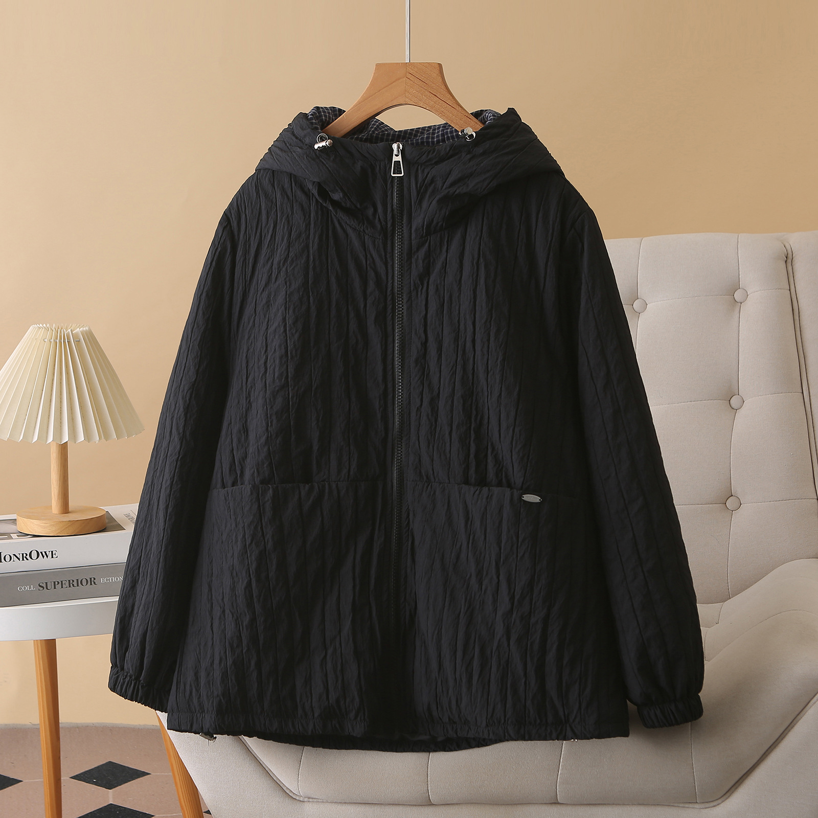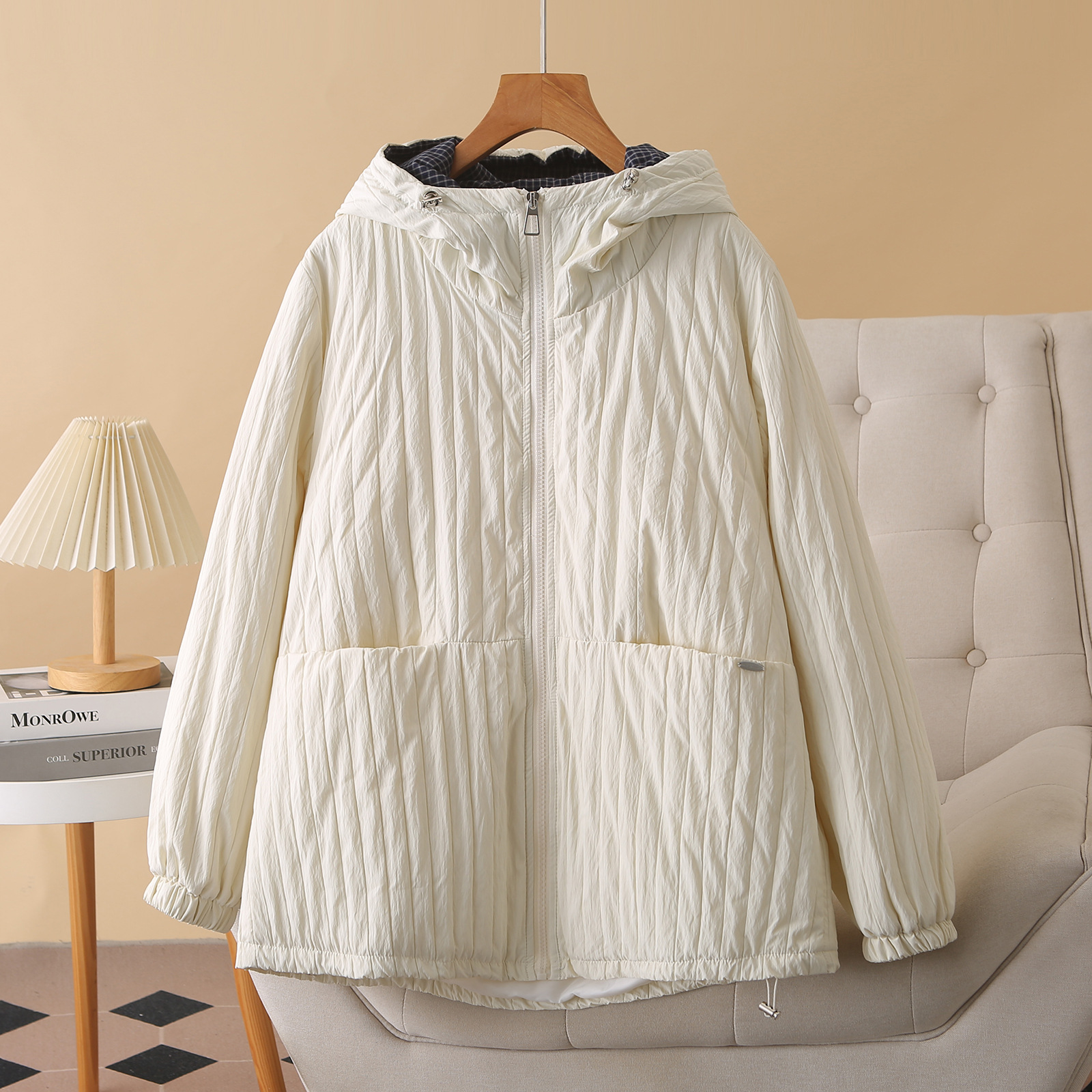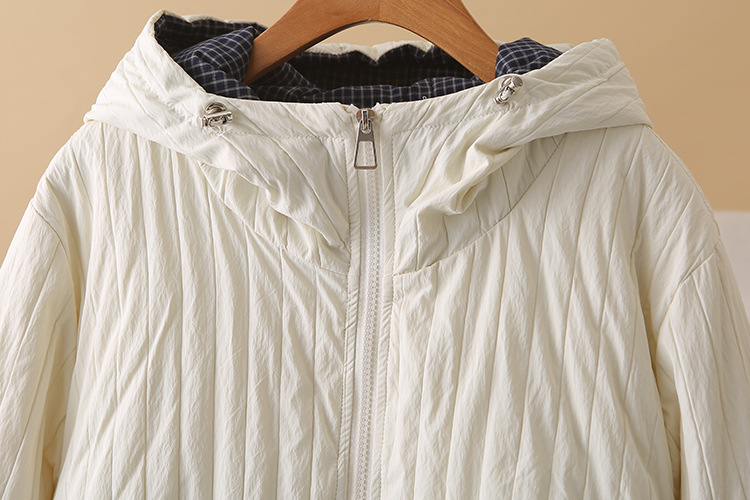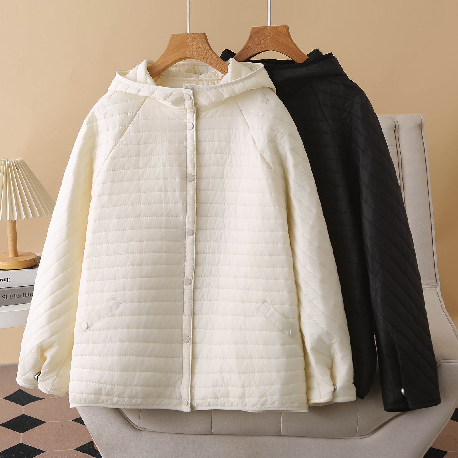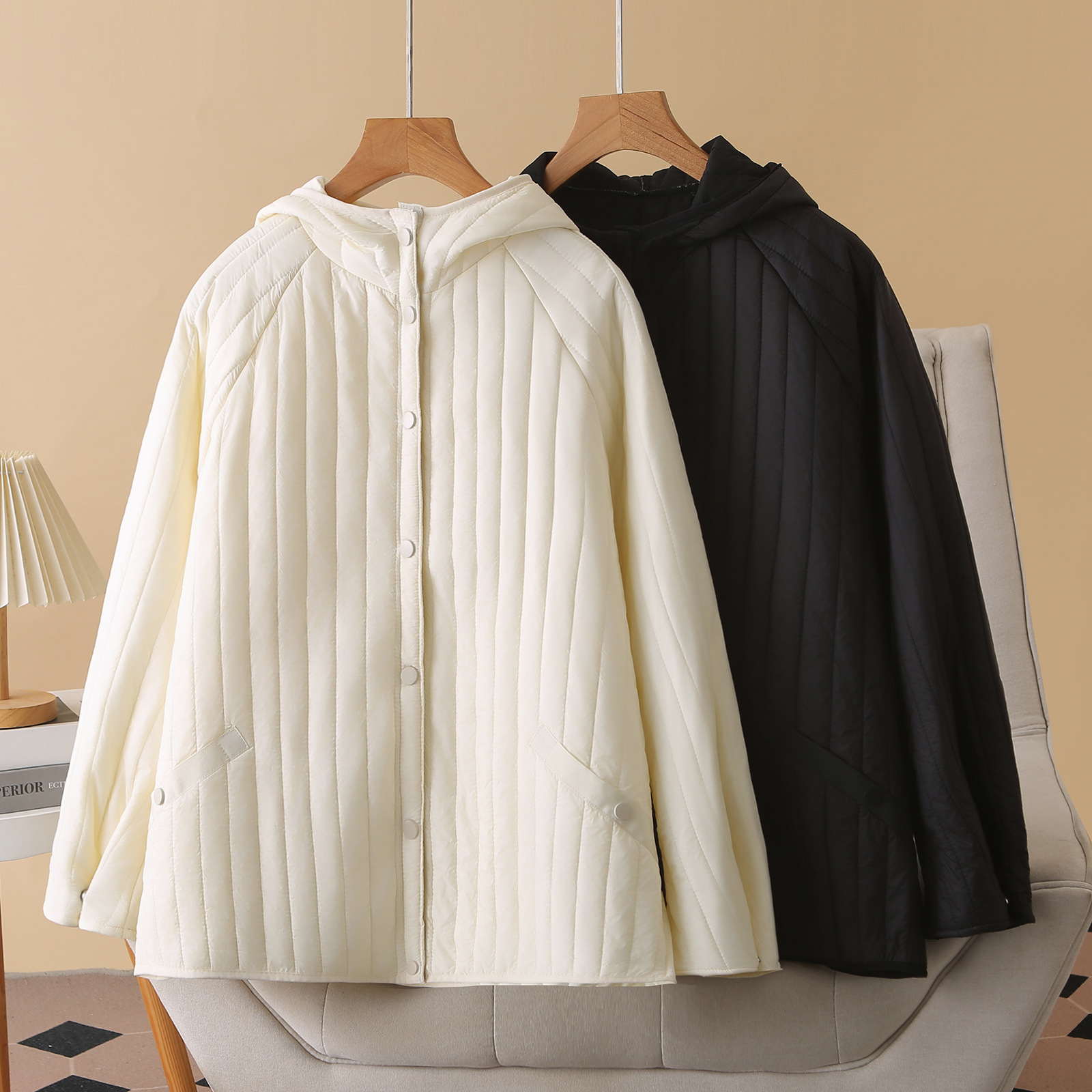 2025秋冬轻薄棉服女大码夹棉外套连帽简约竖条纹上衣胖mm棉衣1732