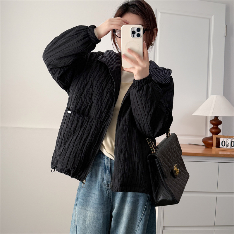大码棉衣女连帽宽松棉服2025秋格子拼接上衣休闲棉外套2579