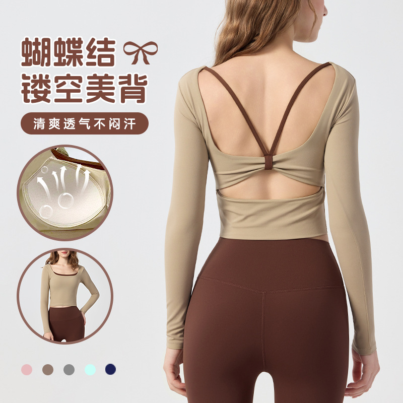 秋冬交差美背ヨガ長袖女性は胸パッドを持って背中の方の襟を露出して体を修理します。