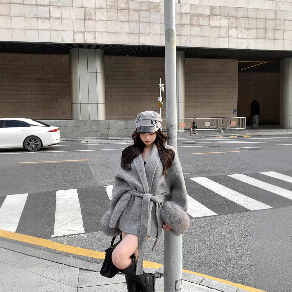 外贸款毛毛袖外套收腰秋季系带毛呢外套短款高级感宽松大衣女灰色