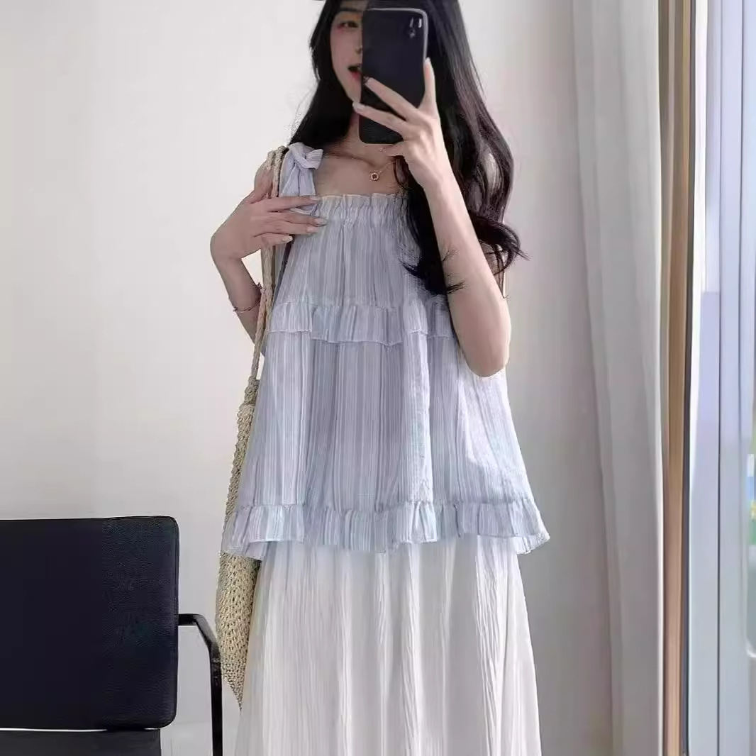 Ins甘辛風小清新ストラップ女性夏新韓国版高腰痩せ人形シャツ上着