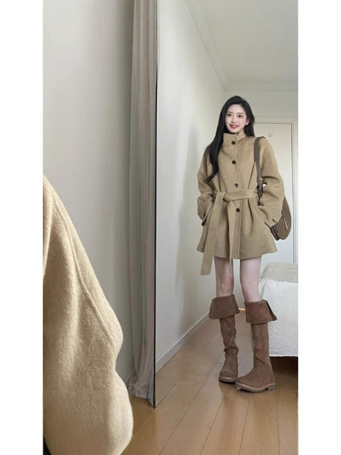 韩国女装采购收腰秋季系带毛呢外套短款高级感韩系慵懒风宽松大衣