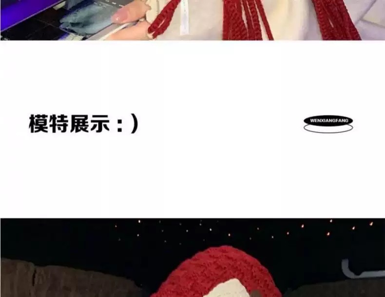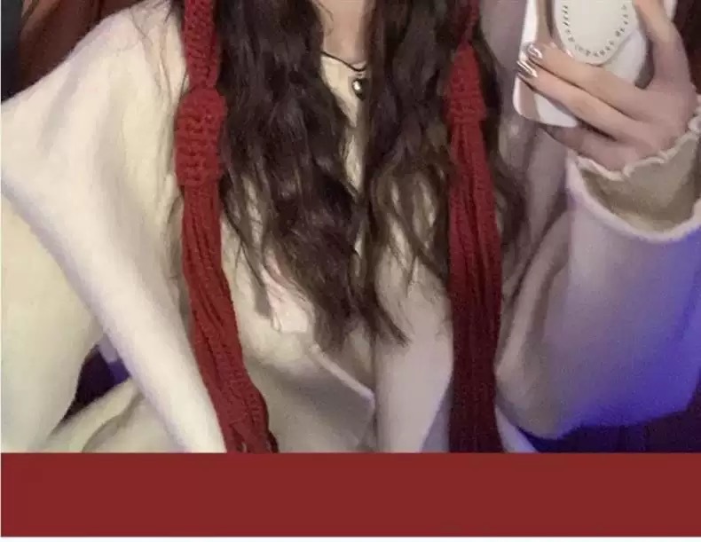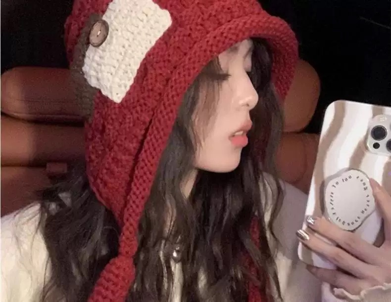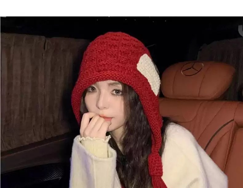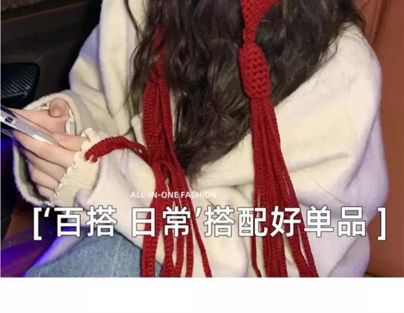 新年红色帽子圣诞节女复古保暖毛线流苏套头帽手工针织护耳毛线帽