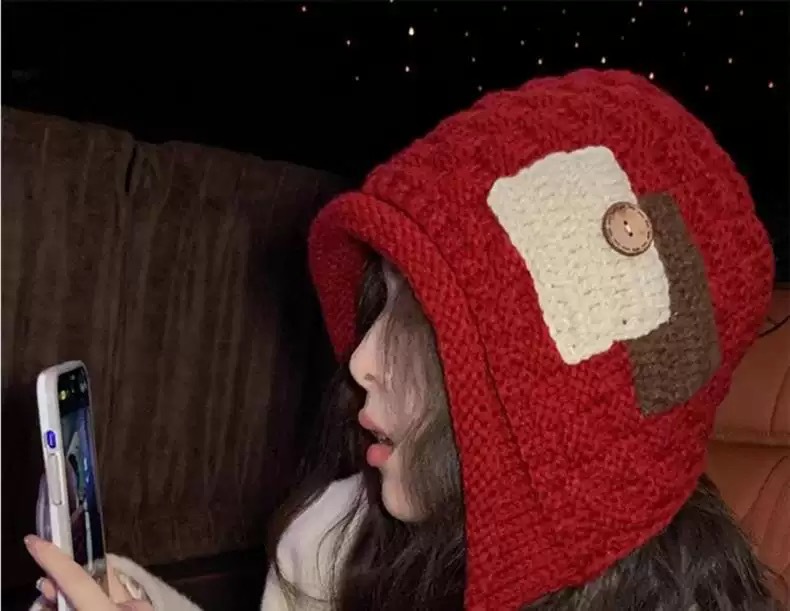 手工辫子针织帽潮新款时尚贴布流苏红色毛线帽子女秋冬季保暖纽扣
