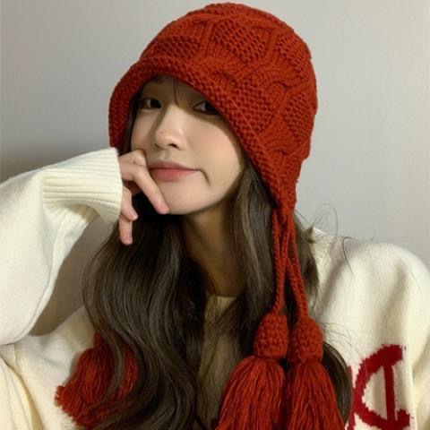 流苏毛线帽子女秋冬天韩版保暖护耳红色针织帽甜美百搭套头帽冷帽