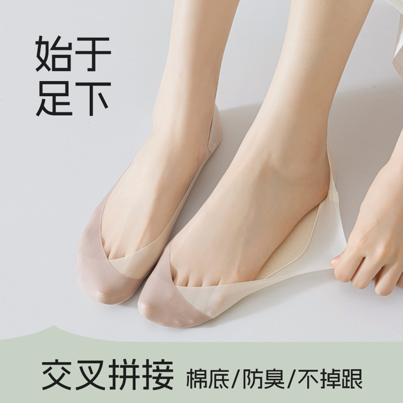 女性用夏用超薄型アイスシルクボートソックス、脱落防止、通気性、消臭性、純綿底クロスステッチ浅口インビジブルソックス