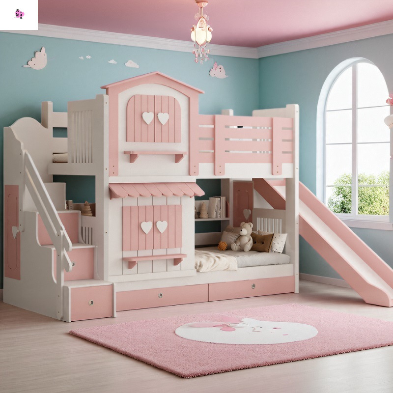 儿童床女孩上下床两层公主风城堡床滑梯床多功能儿童床二层上下铺