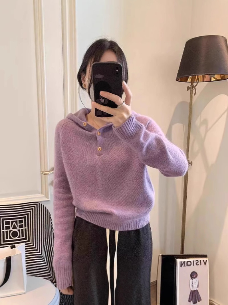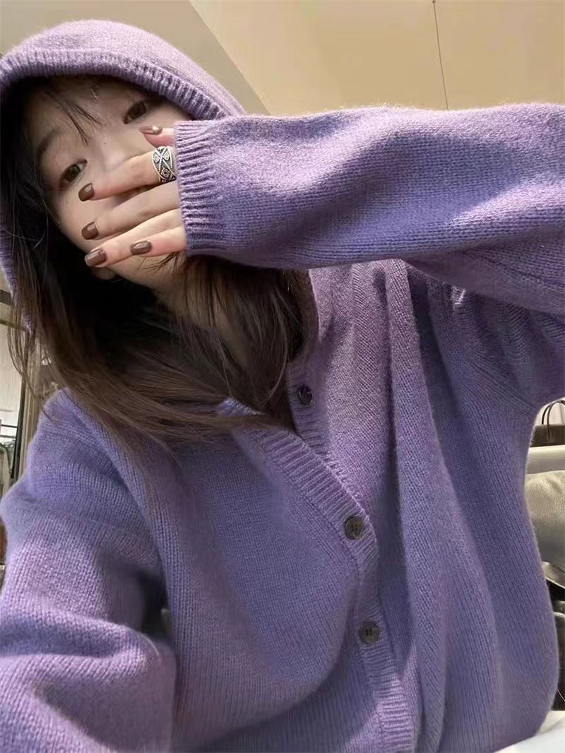 25韩系休闲连帽100羊毛针织开衫女宽松慵懒风软糯显瘦毛衣外套女