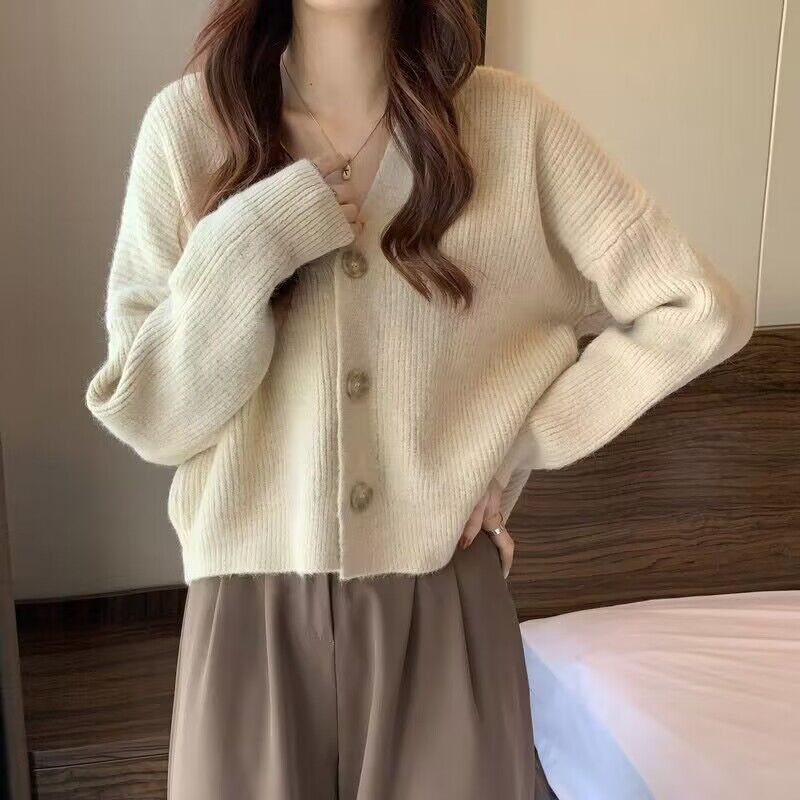 奶系穿搭羊毛软糯V领宽松慵懒风毛衣女秋冬长袖针织开衫外套上衣