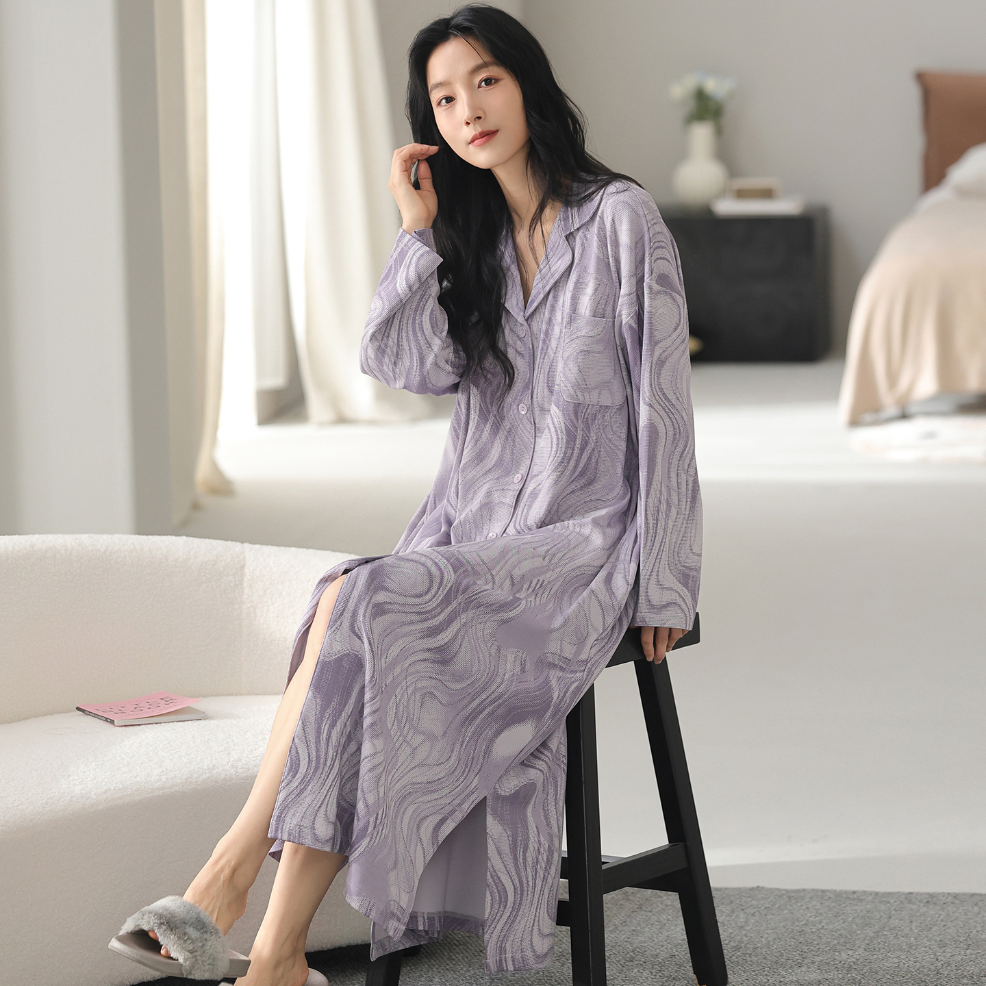 95棉拉架爽棉长袖睡裙女韩版新款开衫翻领连衣裙睡衣春秋季可外穿