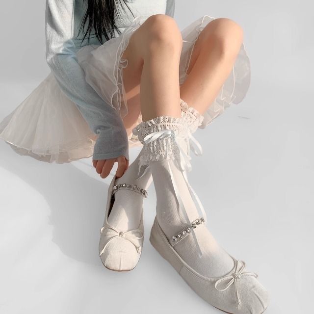 女性用白ミッドカーフソックス、レースリボンリボン、スイートガールバレエ風ロリータソックス
