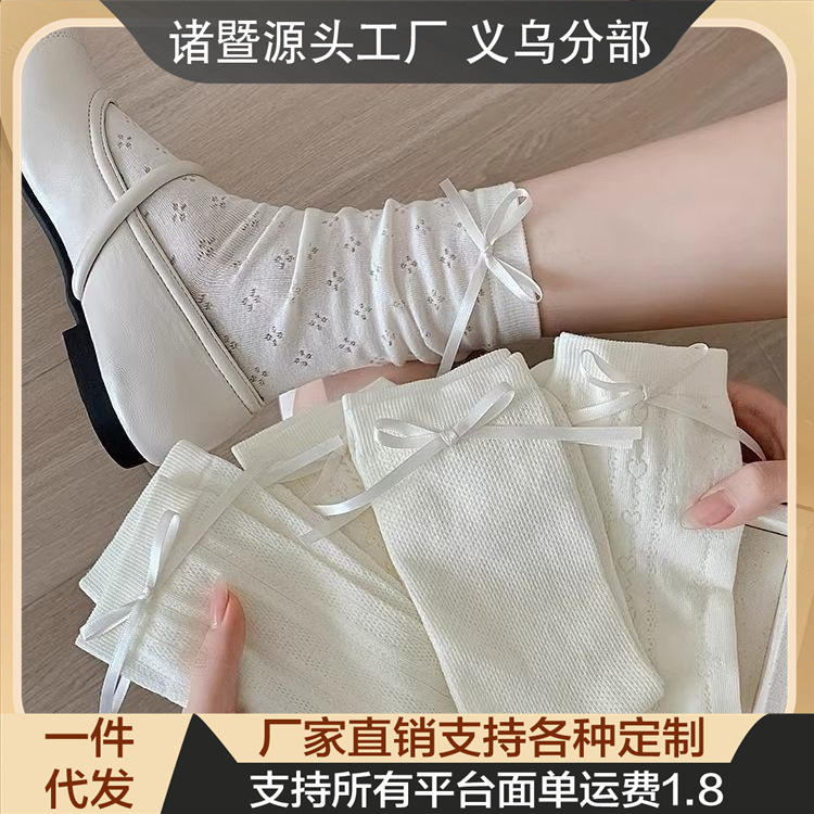 夏季新款日系纯色蕾丝花边透气小腿袜甜美Lolita蝴蝶结白色中筒袜