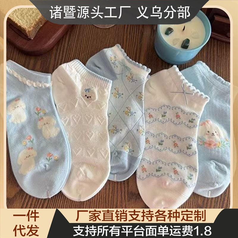 春夏新作森ガールショートソックス花柄通気性ソックス青と白の立体レリーフ刺繍ソックス子犬ソックス