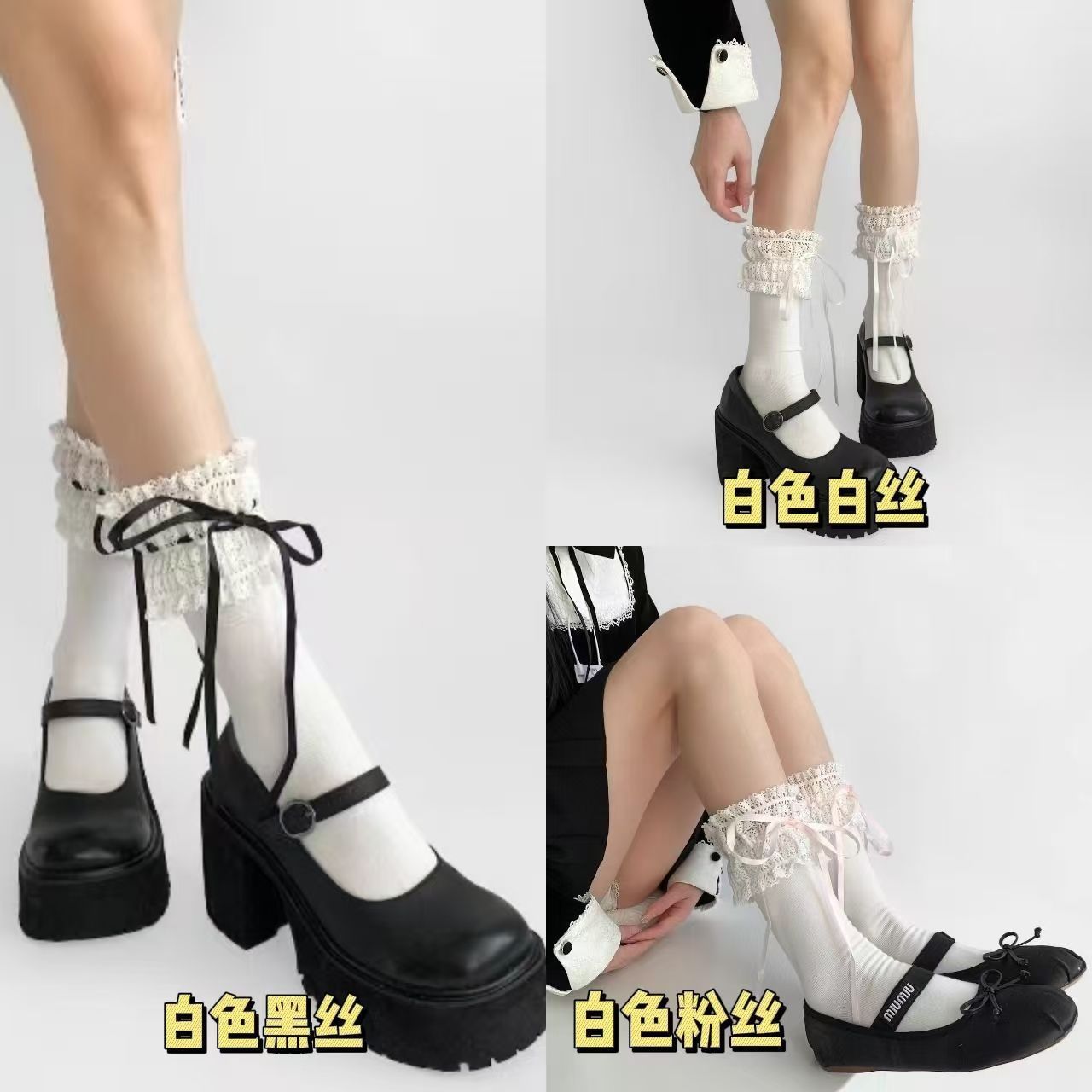 蕾丝花边日系小腿甜美堆堆蝴蝶结中筒袜子少女中筒洛丽塔可爱白色