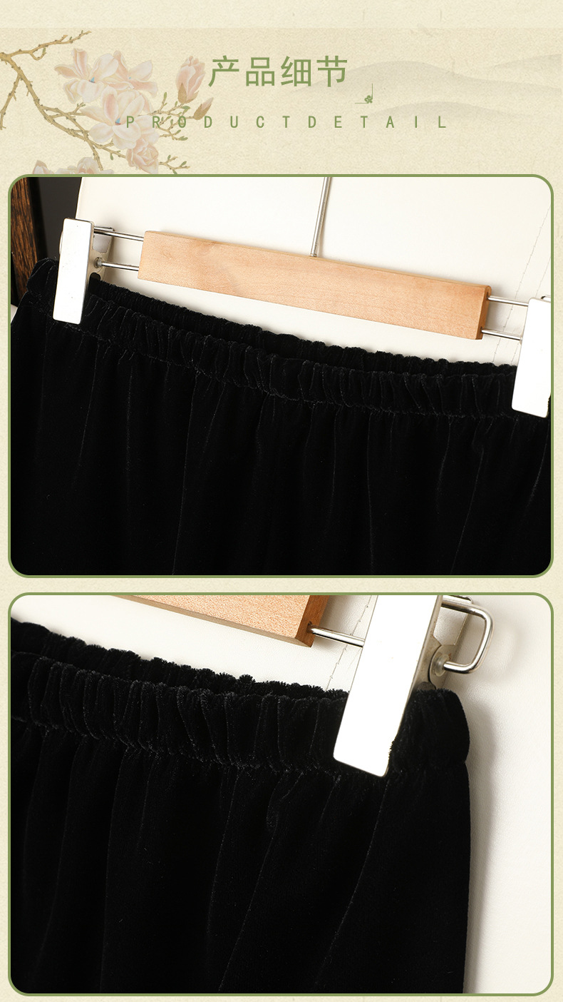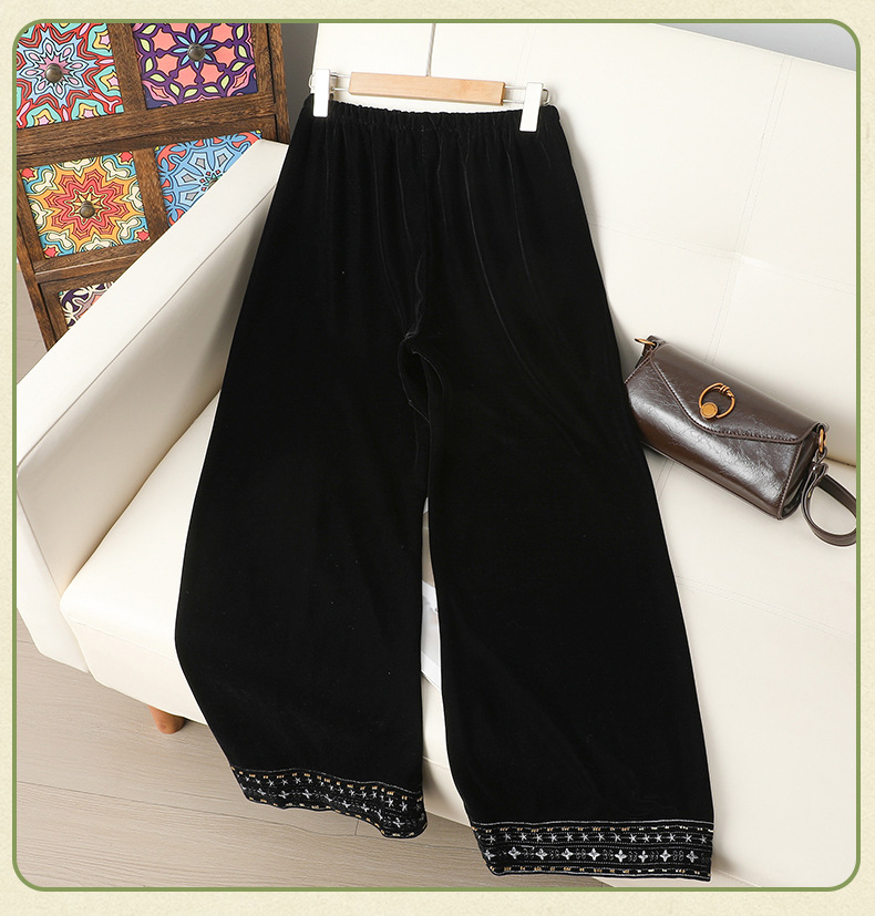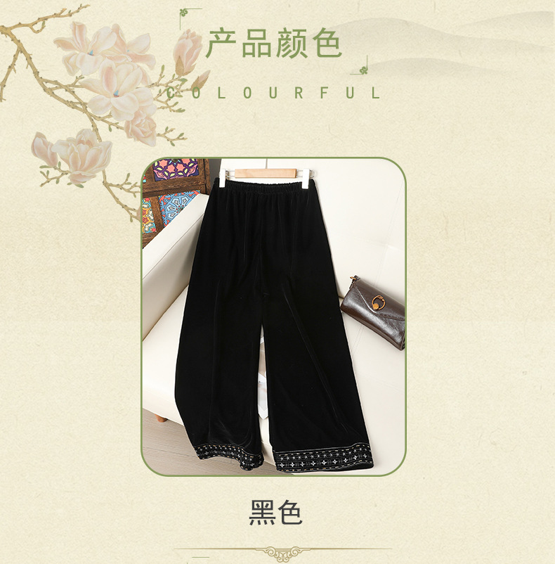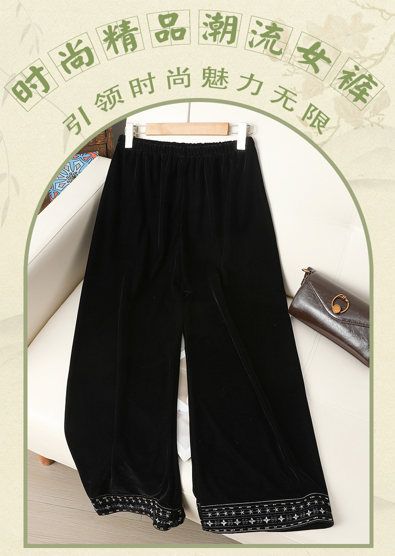简约百搭黑色丝绒直筒裤女洋气绣花中式国风长裤秋装显瘦遮肉裤子