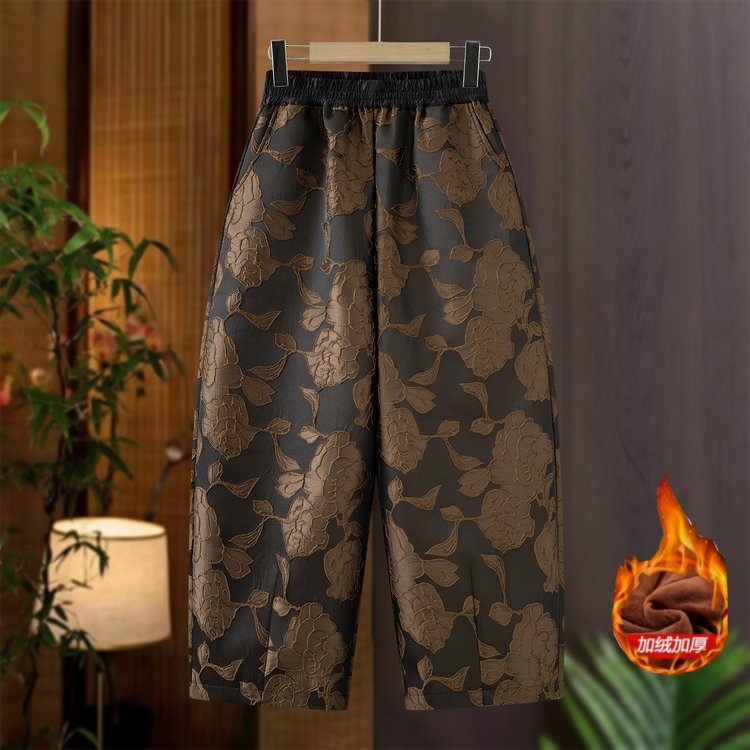 秋冬加绒保暖长裤女洋气提花新中式国风花苞裤气质百搭显瘦哈伦裤