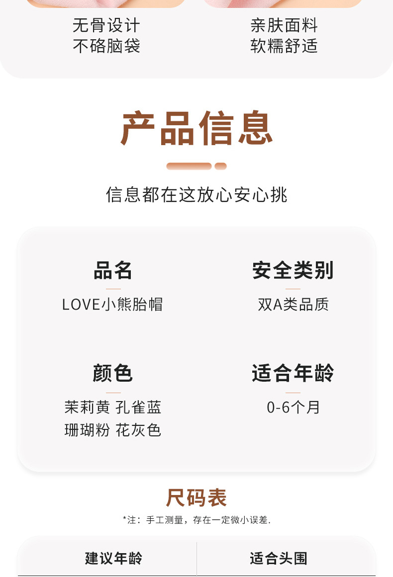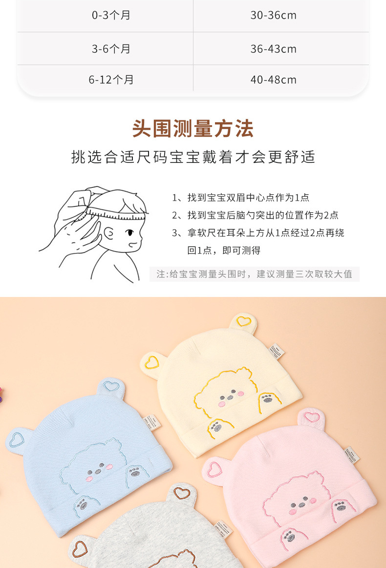 尺码 0-3个月【头围31-36cm以内】,3-6个月【头围35-43cm以内】,6-12个月【头围40-48cm以内】