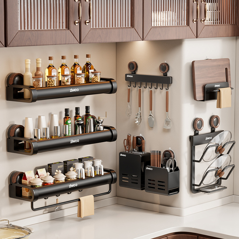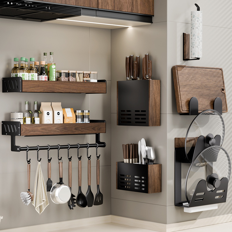 胡桃の木の台所の物置棚の調味料棚は穴を開けないで多層の刀の棚の鍋の蓋の箸のスプーンの壁の壁掛けの収納棚を作ります。