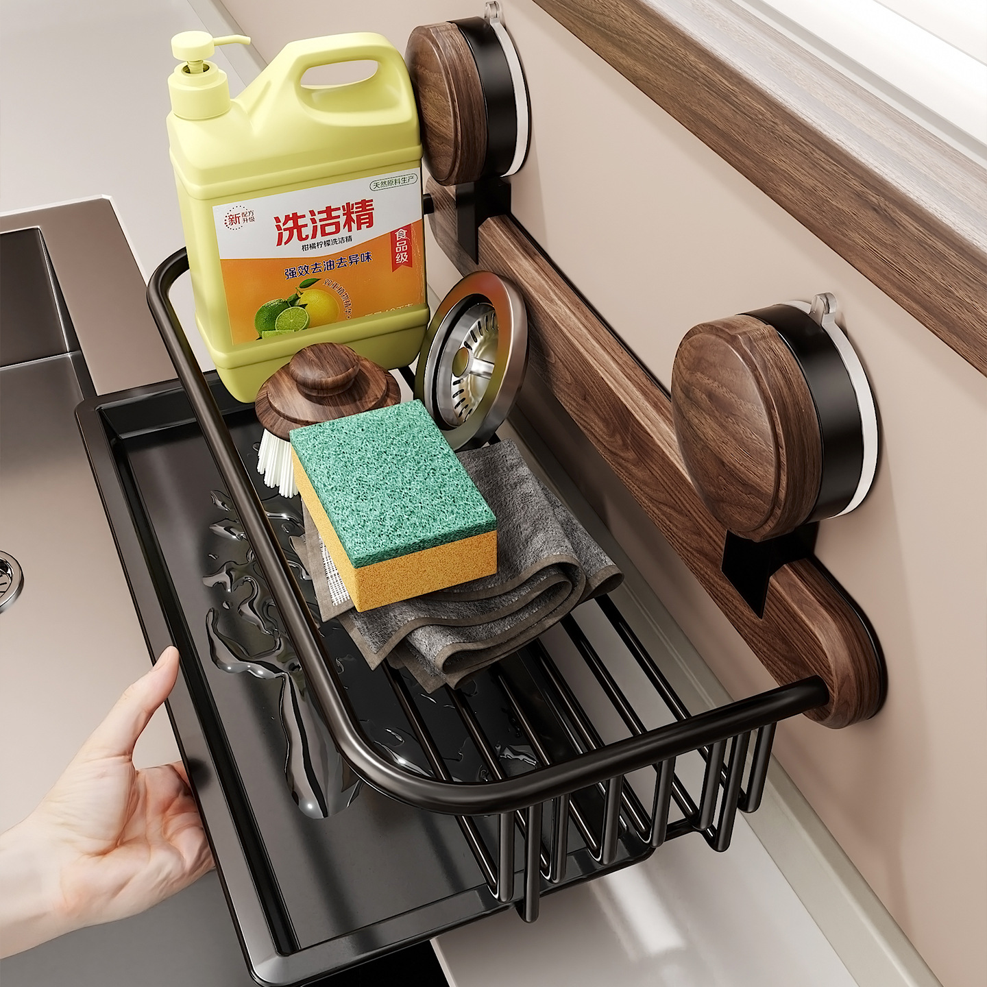 胡桃木吸盘厨房置物架免打孔抹布沥水架壁挂水龙头水槽收纳沥水篮
