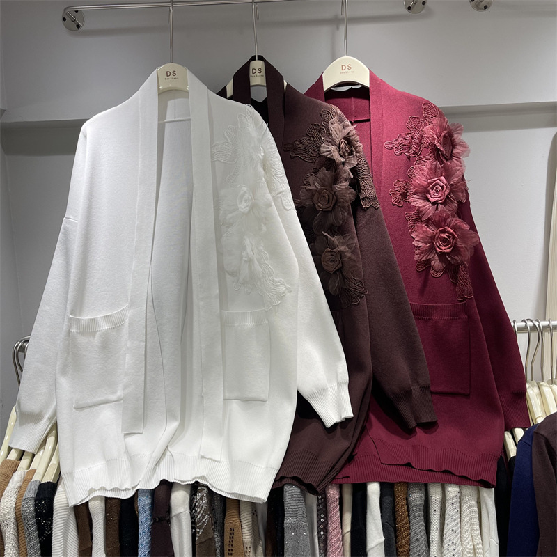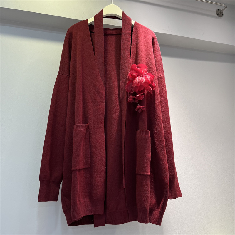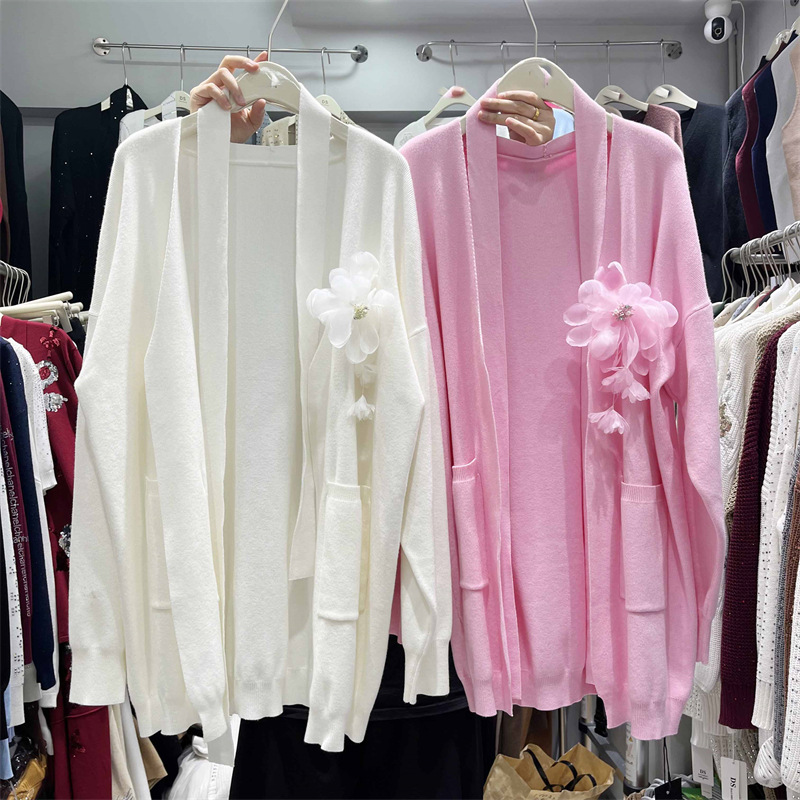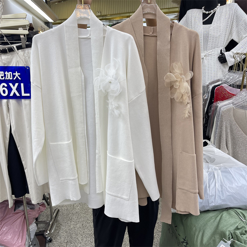 立体花朵长袖针织开衫女秋季新款中长款慵懒宽松时尚外搭毛衣外套