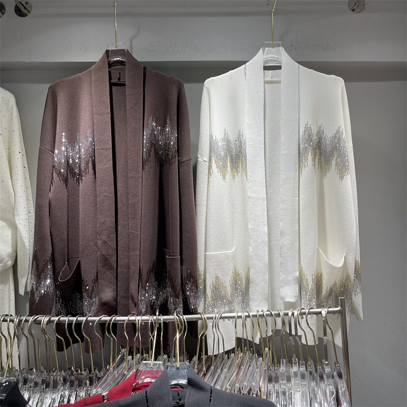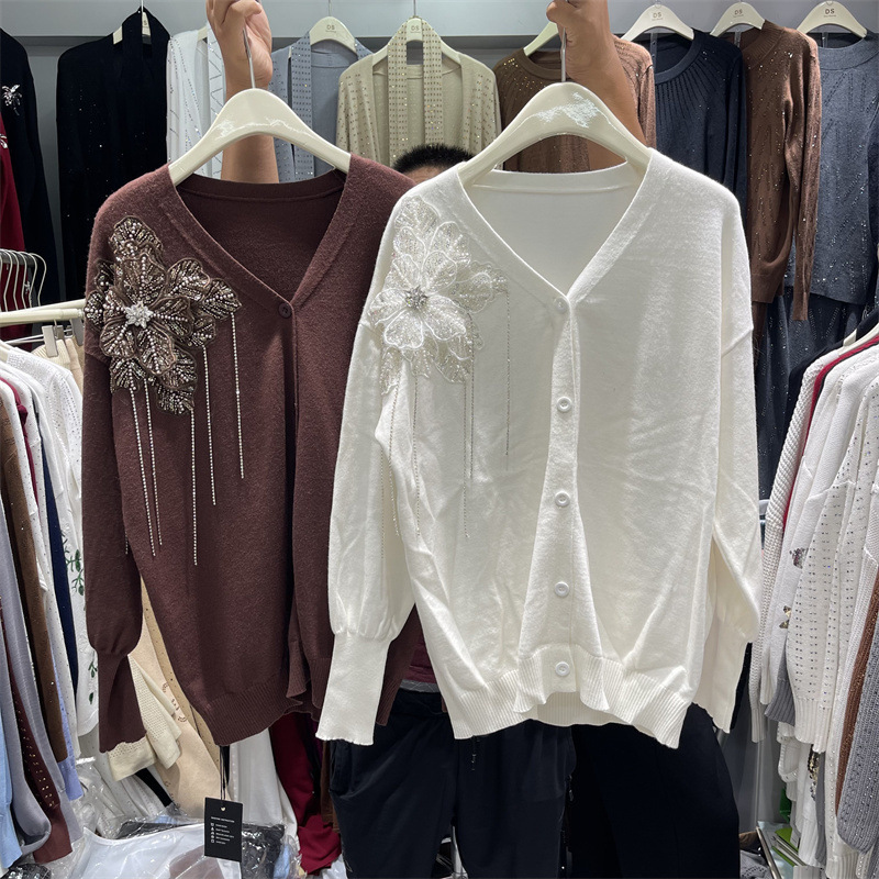 欧美跨境重工钉钻V领针织开衫女秋冬新款慵懒风宽松大码毛衣外套