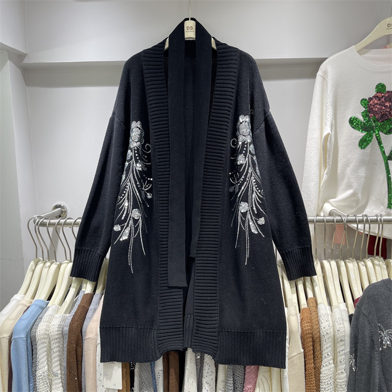 欧美跨境重工亮片刺绣针织开衫女秋冬新款中长款宽松系带毛衣外套