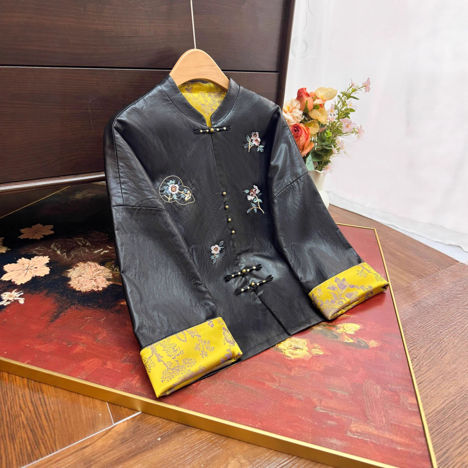 新中式双面穿刺绣提花皮外套2025秋季新款衬衫立领盘扣百搭上衣女