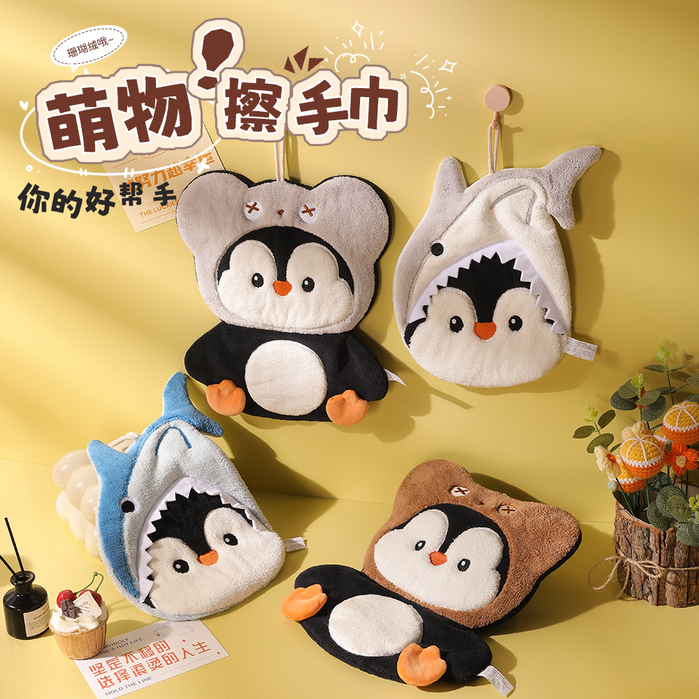 奇思妙想企鹅加大加厚挂式擦手巾珊瑚绒两用毛巾吸水速干不掉毛