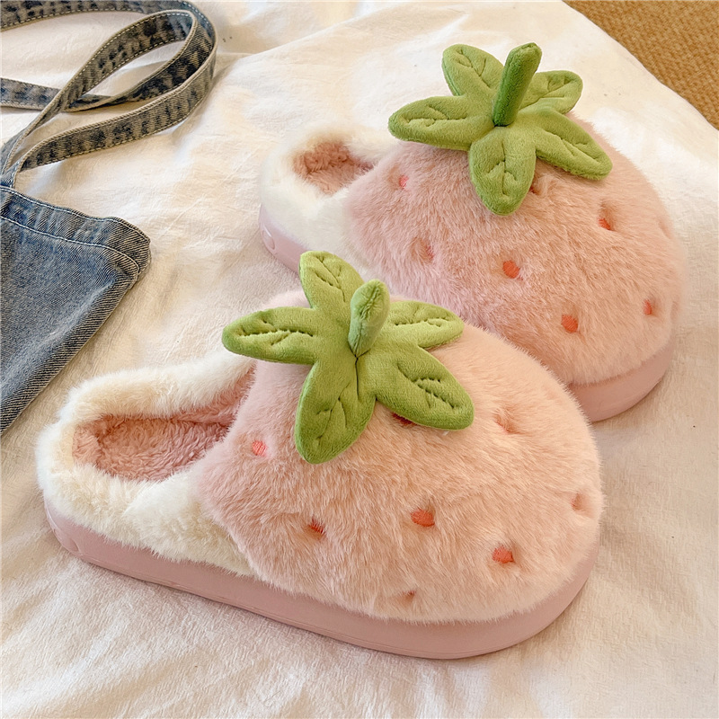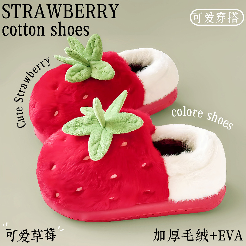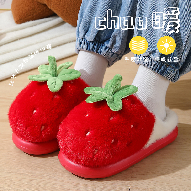 可爱草莓棉拖鞋女秋冬季家用厚底踩屎感拖鞋冬天毛绒保暖防滑轻便