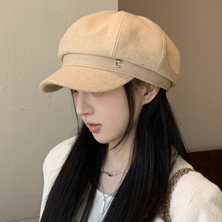 2025年新款韩版百搭亮片八角帽子女春秋季复古英伦风贝雷帽鸭舌帽