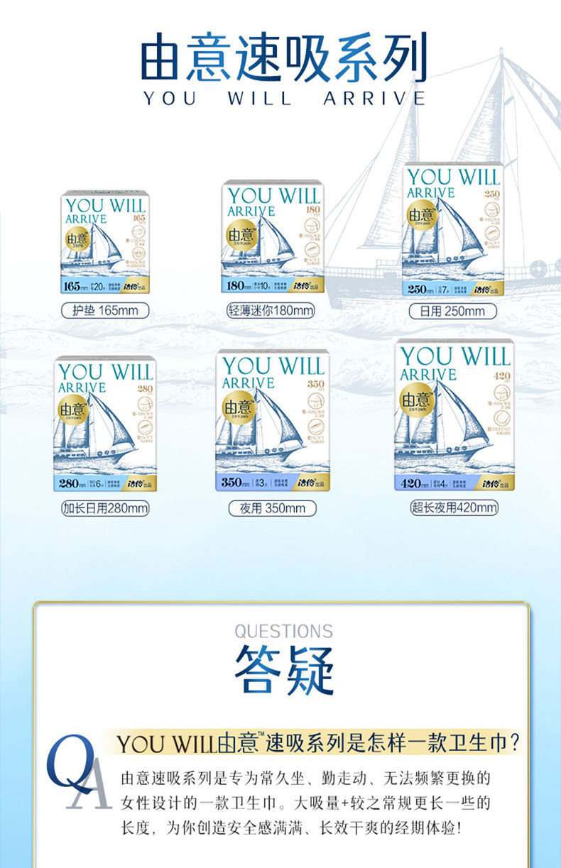 卫生巾长度 由意180迷你巾10片装(2368),由意250日用7片装(2399),由意280加长日用6片装(2405),由意420超长夜用4片装(2351),由意350夜用3片装(2412)