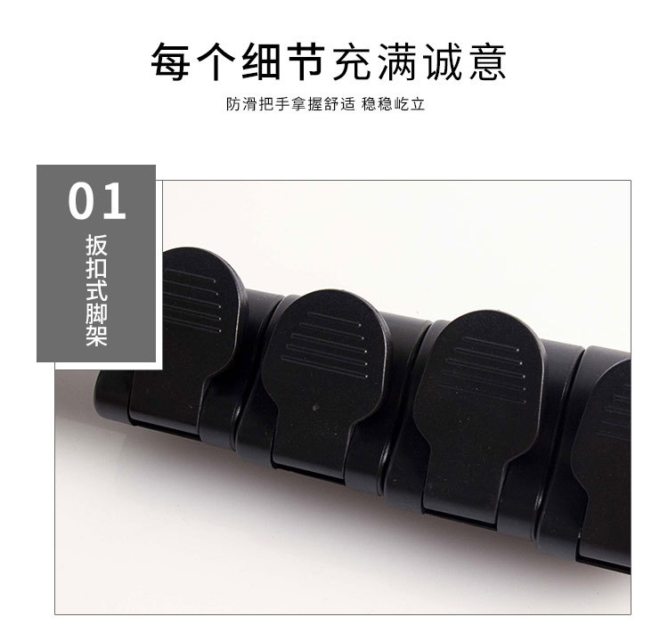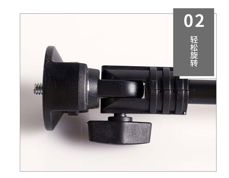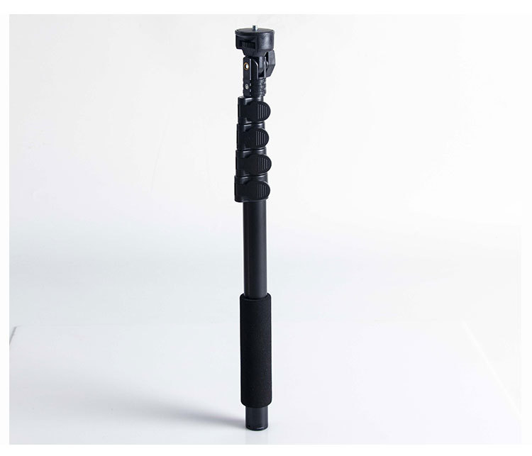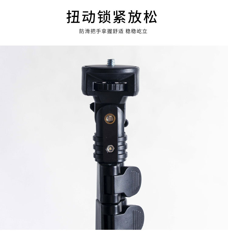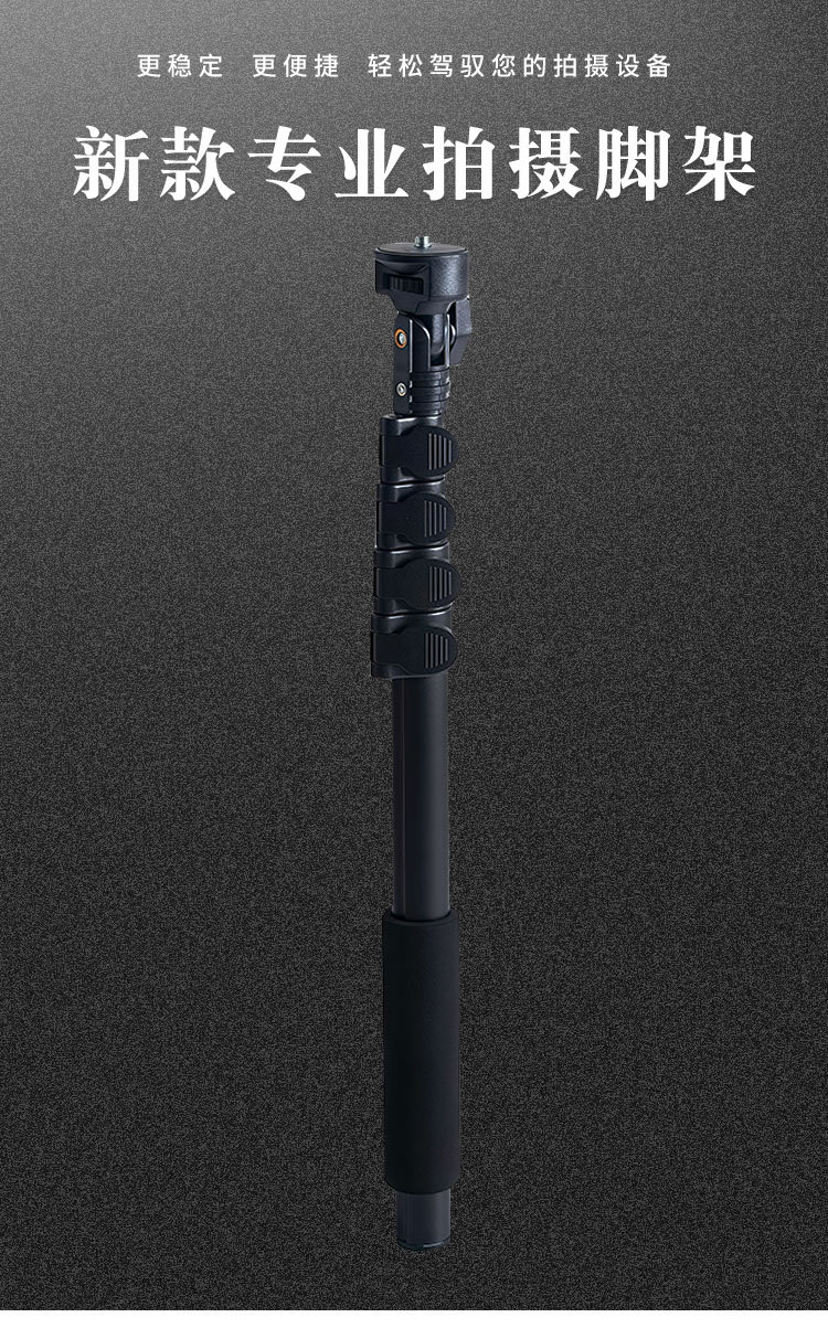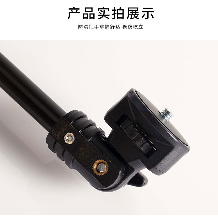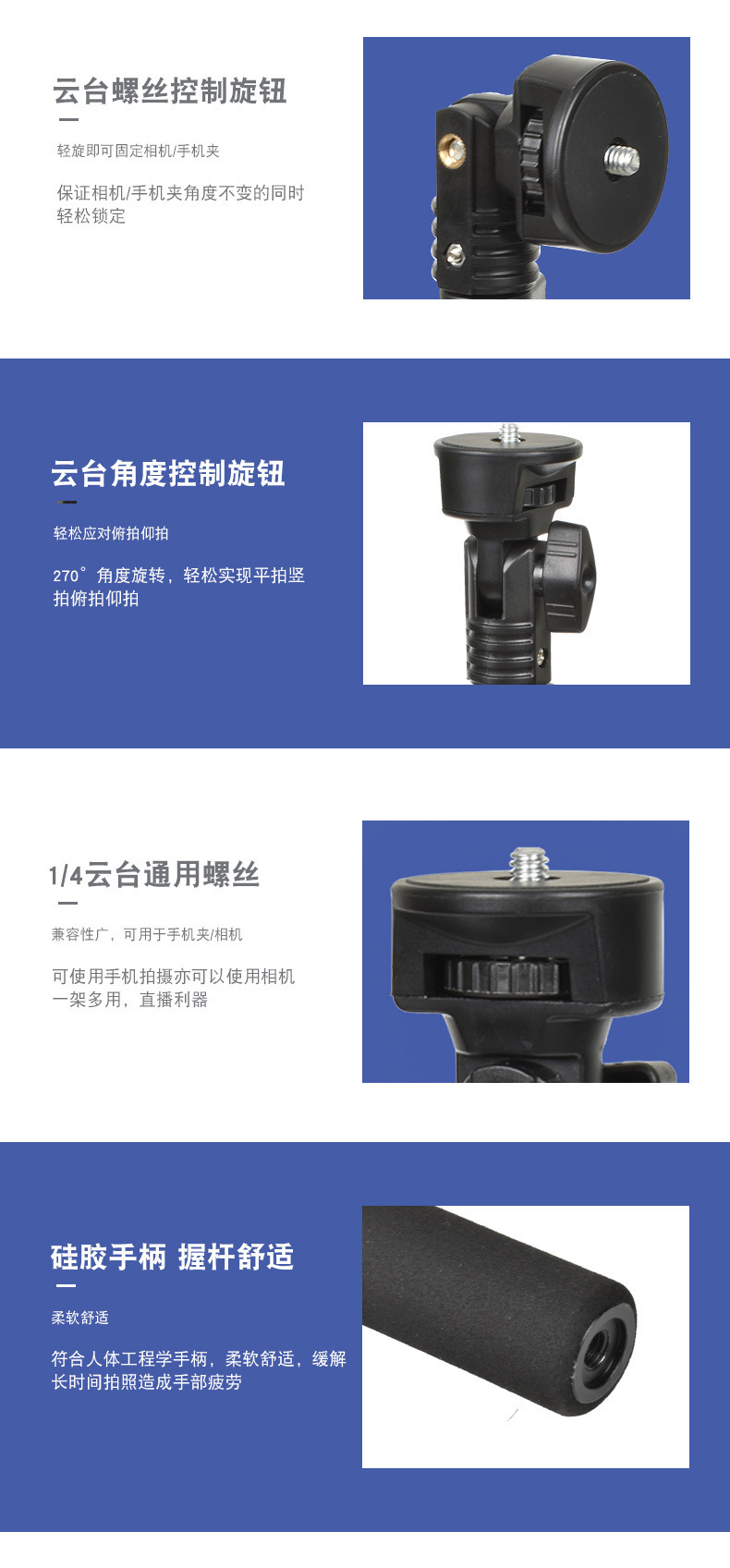 扳扣式锁紧结构 ,操作简单易行,可以任意锁紧固定长度使用,顶部是四分之一螺丝 ,云台有快装螺丝 ,可以270度调整角度。底部有四分之一螺丝 ,配有海绵手柄,防滑,舒适。可用于相机,手机,自拍Vlog拍摄。