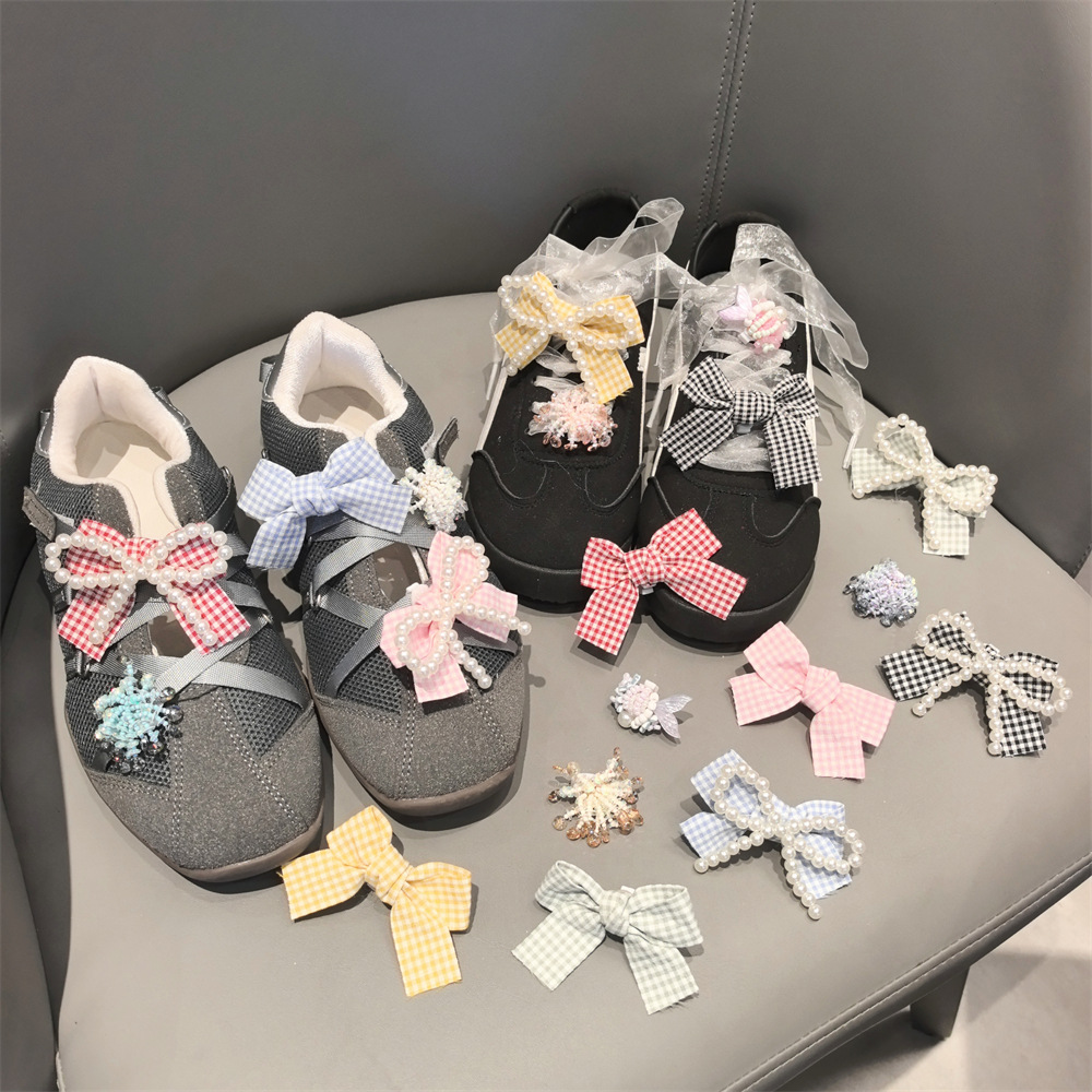 新款珍珠格子蝴蝶结鞋花串珠烟花少女芭蕾德训鞋装饰可拆卸鞋带扣