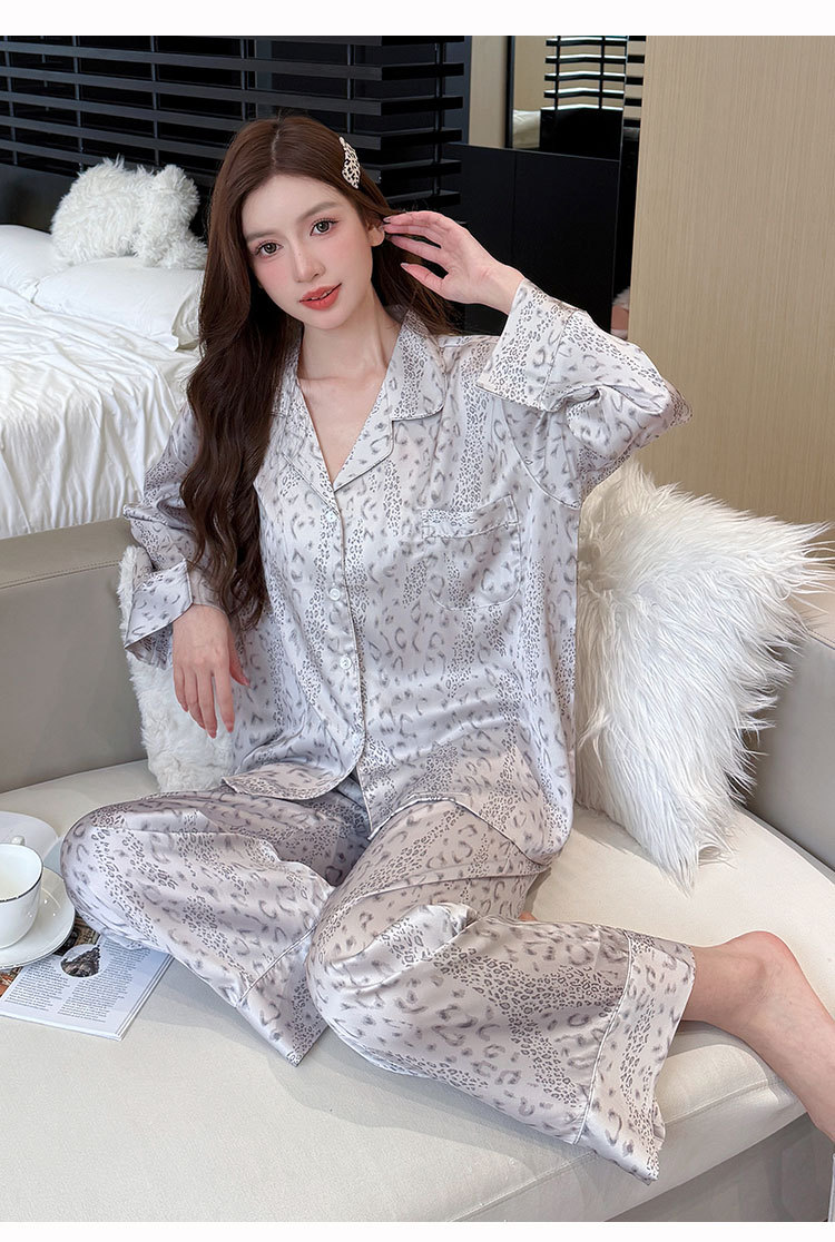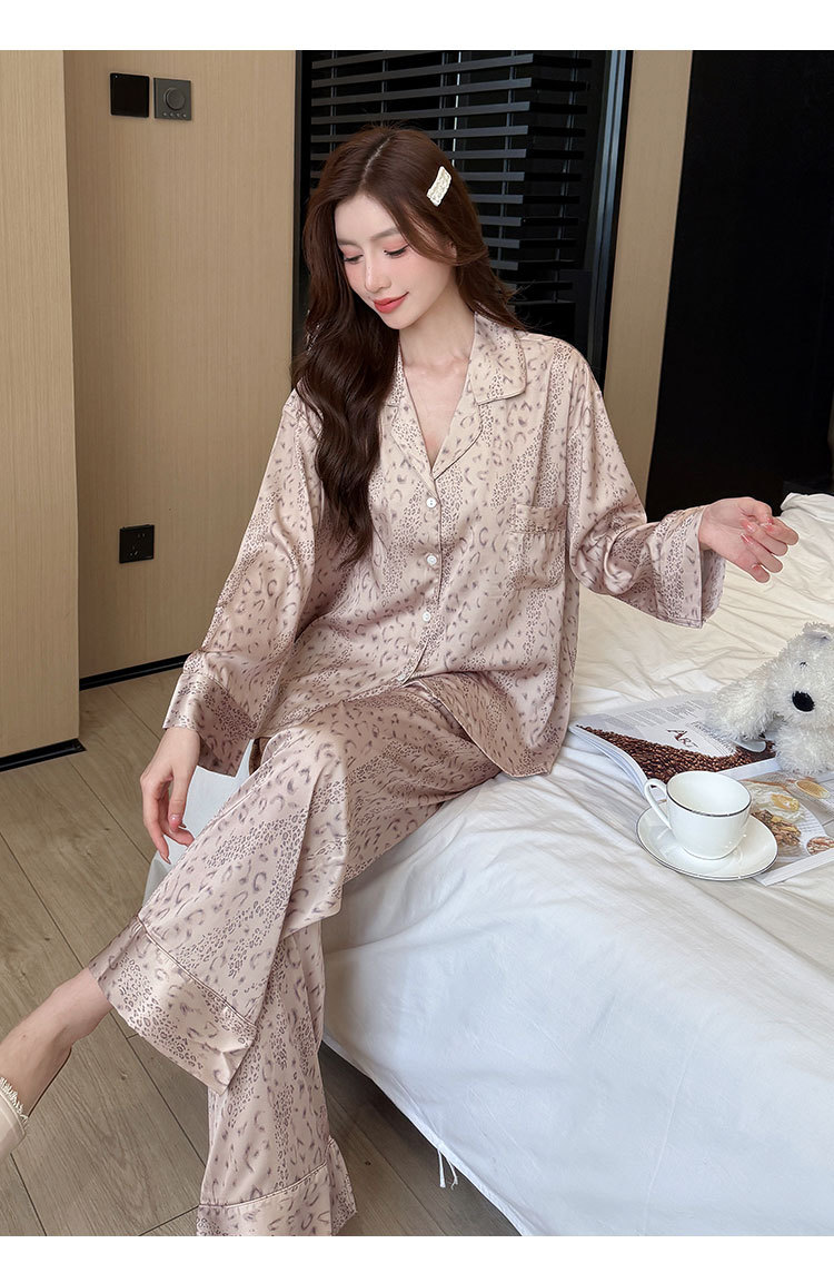 法式轻奢高级感豹纹印花缎面冰丝睡衣女款春秋季家居服套装可外穿
